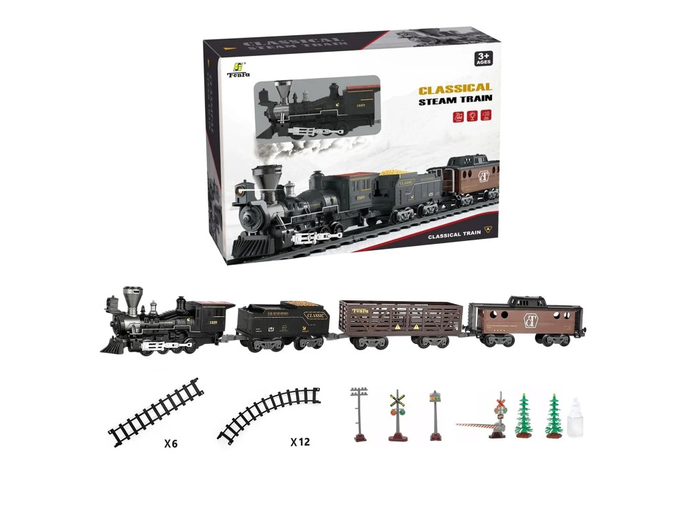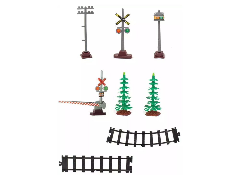 Комплект поставки: локомотив, вагонетка с углем, вагон-рефрижератор, вагон-хоппер, железнодорожное полотно (18 сегментов), железнодорожные знаки, деревья, емкость для воды