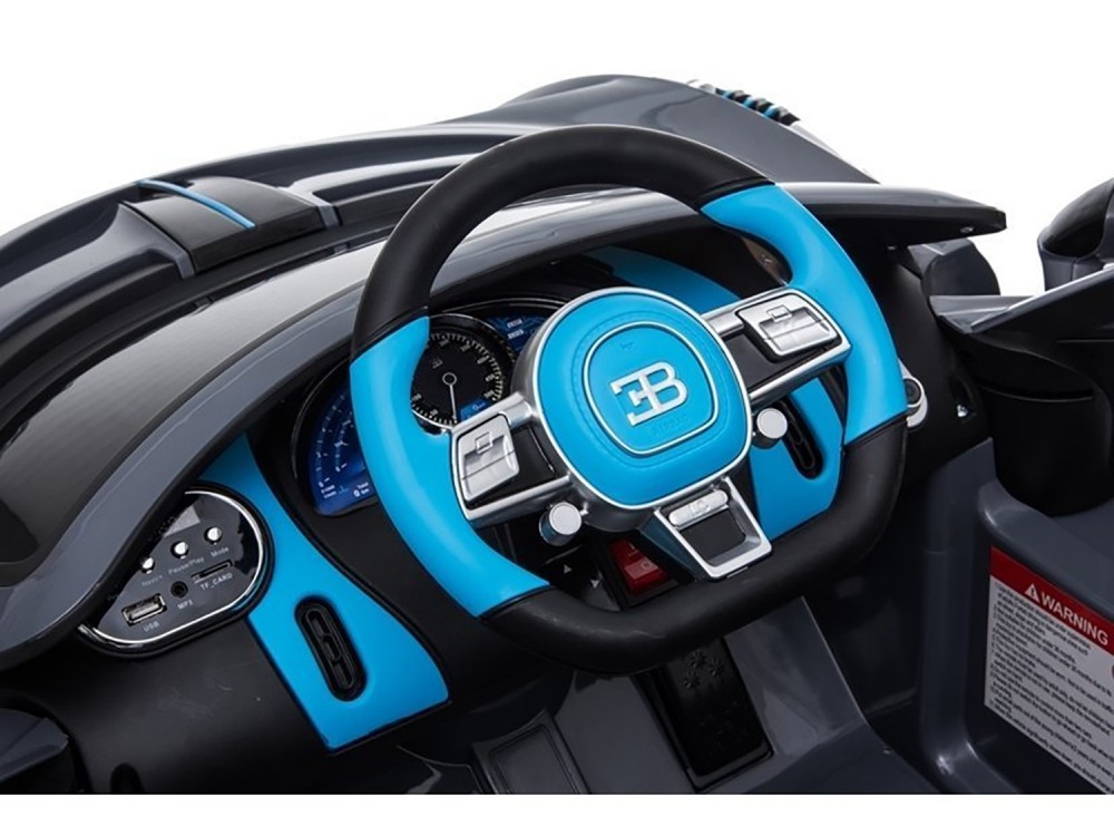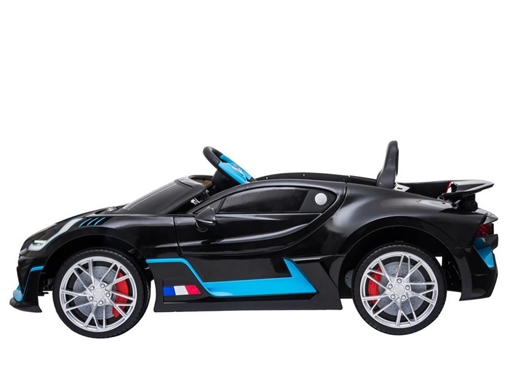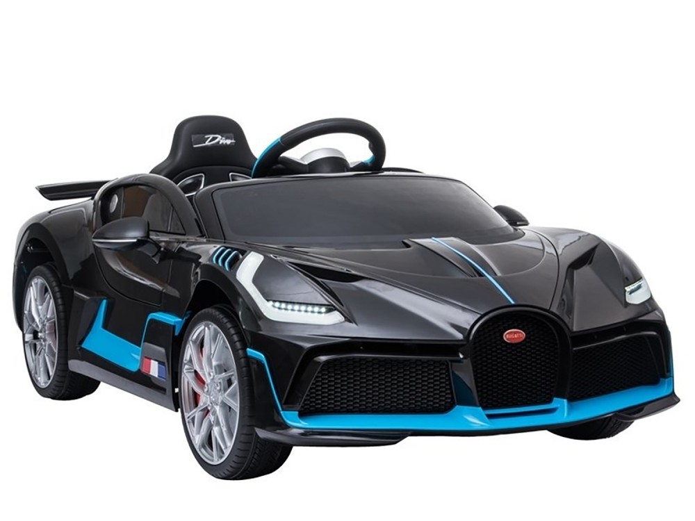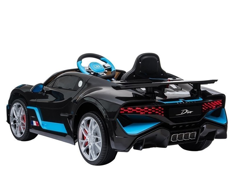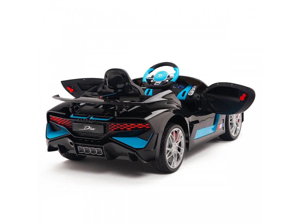 Детский электромобиль Bugatti Divo (черный, 12V) - HL338 - это детский одноместный электромобиль Bugatti Divo по лицензии известного автоконцерна выполнен по стилю легендарной спортивной версии Bugatti. Двухскоростной автомобиль с пультом радиоуправления, у него открываются боковые двери и багажник. Отличие этой модели от других – мягкие резиновые колеса, встроенная магнитола, LEВ подсветка фар и звук мотора, сиденье из перфорированной черной экокожи с логотипом и пульт управления 2.4G.