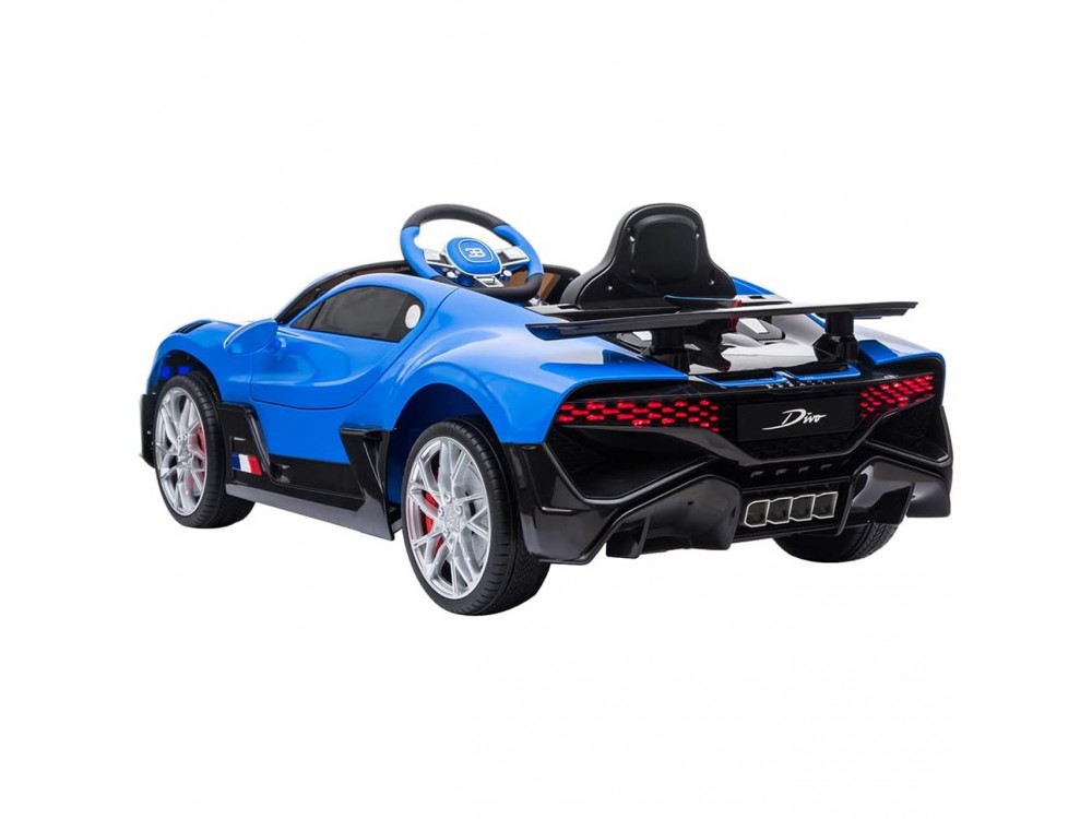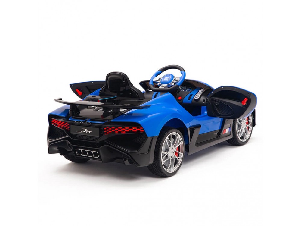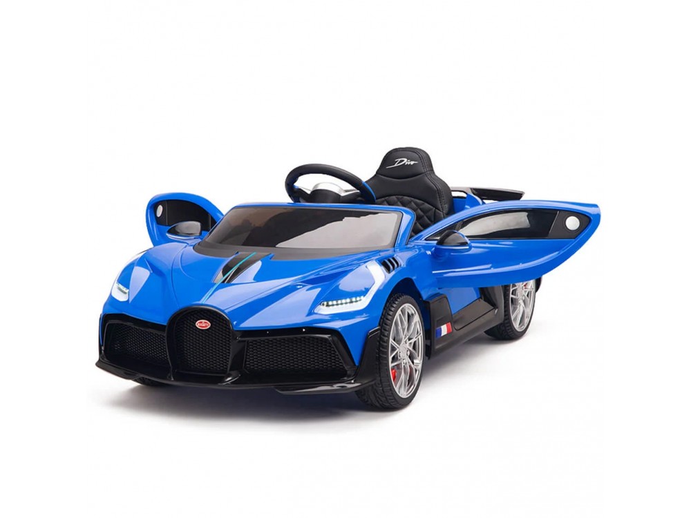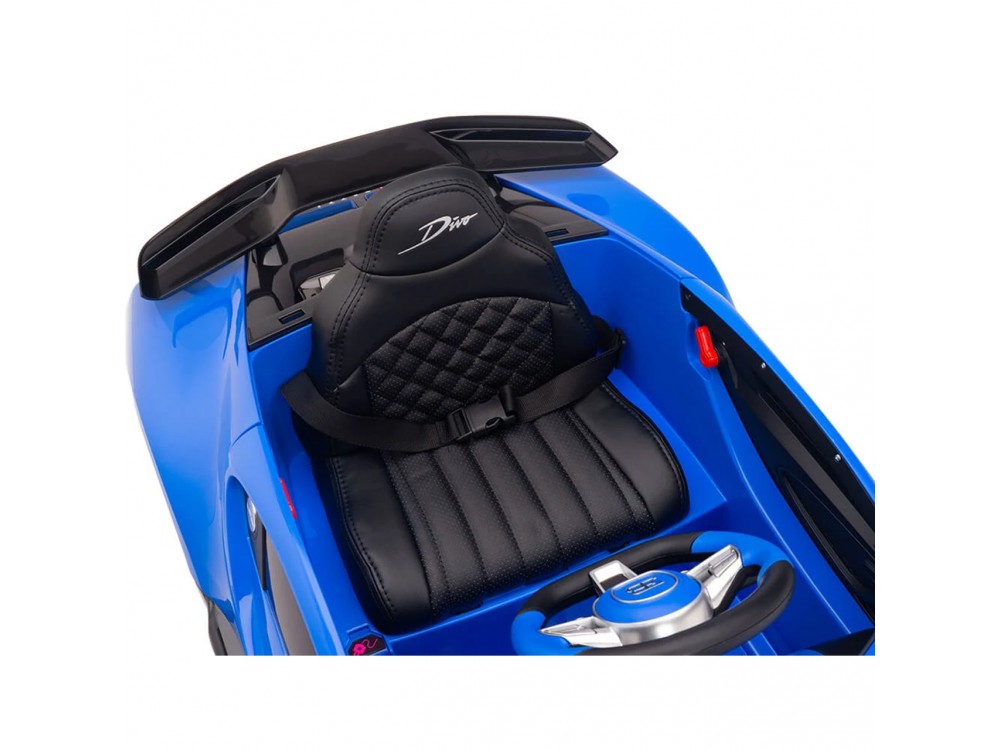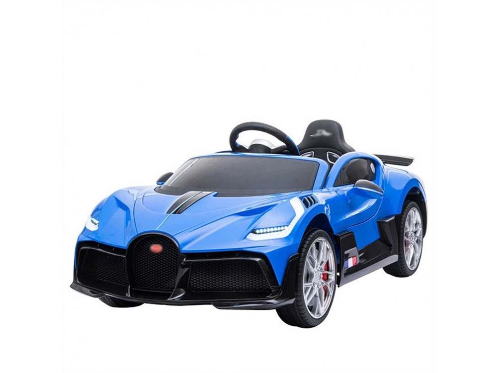 Детский электромобиль Bugatti Divo (синий, 12V) - HL338 - это детский одноместный электромобиль Bugatti Divo по лицензии известного автоконцерна выполнен по стилю легендарной спортивной версии Bugatti. Двухскоростной автомобиль с пультом радиоуправления, у него открываются боковые двери и багажник. Отличие этой модели от других – мягкие резиновые колеса, встроенная магнитола, LEВ подсветка фар и звук мотора, сиденье из перфорированной черной экокожи с логотипом и пульт управления 2.4G.
