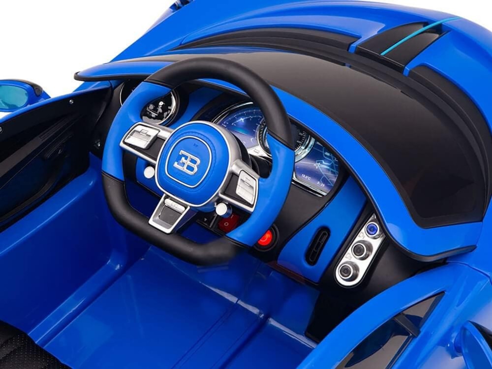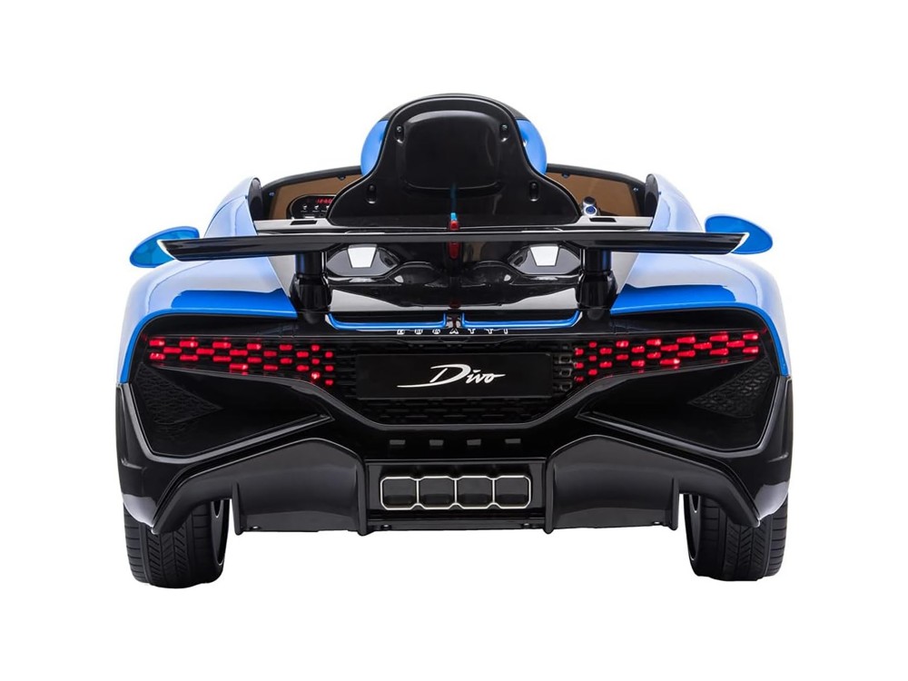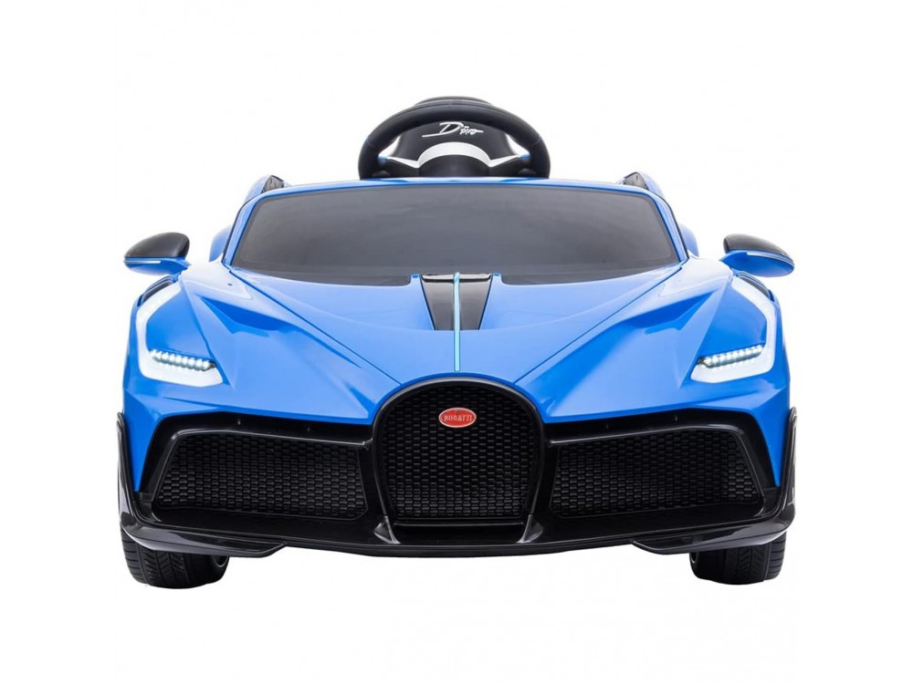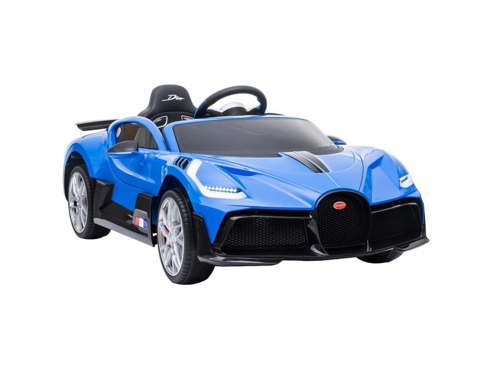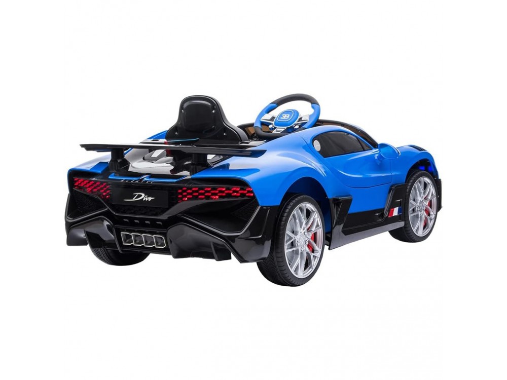 Детский электромобиль Bugatti Divo (синий, 12V) - HL338 - это детский одноместный электромобиль Bugatti Divo по лицензии известного автоконцерна выполнен по стилю легендарной спортивной версии Bugatti. Двухскоростной автомобиль с пультом радиоуправления, у него открываются боковые двери и багажник. Отличие этой модели от других – мягкие резиновые колеса, встроенная магнитола, LEВ подсветка фар и звук мотора, сиденье из перфорированной черной экокожи с логотипом и пульт управления 2.4G.