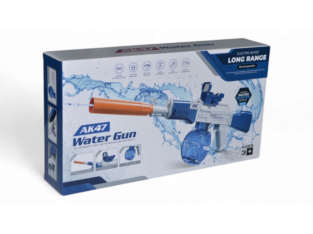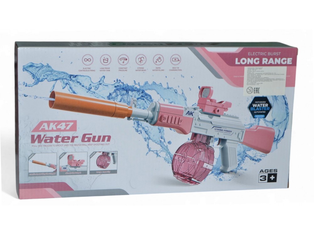 Автомат изготовлен из прочного и безопасного пластика, а также включает в себя электронные компоненты для автоматической подачи воды. Благодаря этому, для стрельбы не требуется ручная подкачка – достаточно просто нажать на курок.