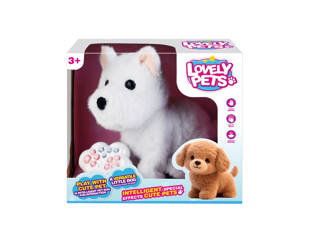 - Интерактивная собачка мягкая и приятная на ощупь, умеет ходить, делать акробатические трюки, реагирует на прикосновения и хлопки, может двигаться и воспроизводит звуки настоящей собаки.