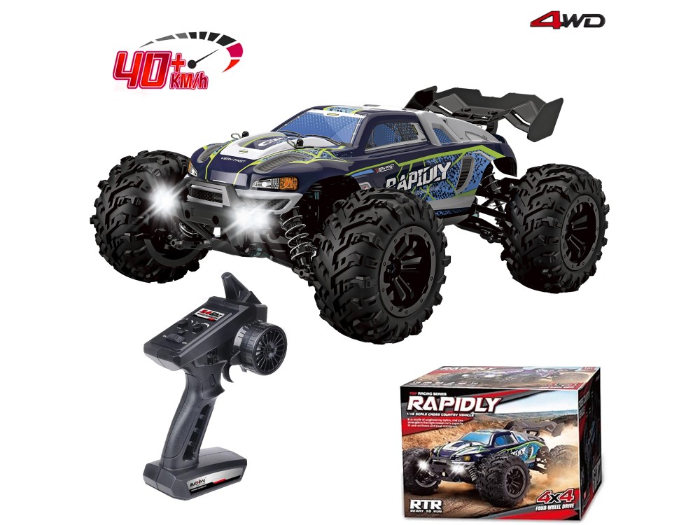 Полный привод повышает проходимость и управляемость модели. На автомодель Rapidly установлен коллекторный двигатель 390 класса и влагозащищенный приемник с системой защиты от брызг. Мощный аккумулятор Li-Ion 7.4V 1300 mah, идущий в комплекте, позволяет непрерывно играть до 20 минут! Пульт управления на частоте 2.4Ghz позволит управлять моделью на расстоянии до 80 метров. LED подсветка переднего бампера сделаем игру в темное время суток незабываемой.
