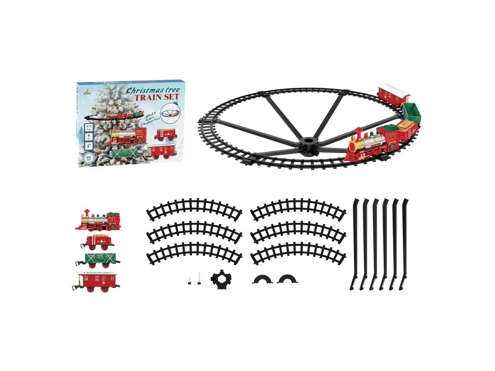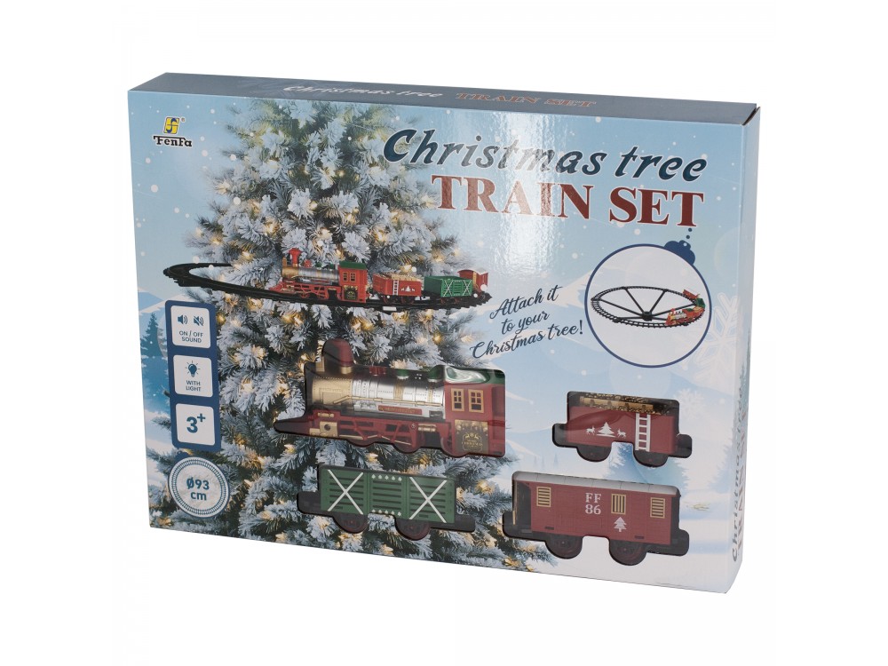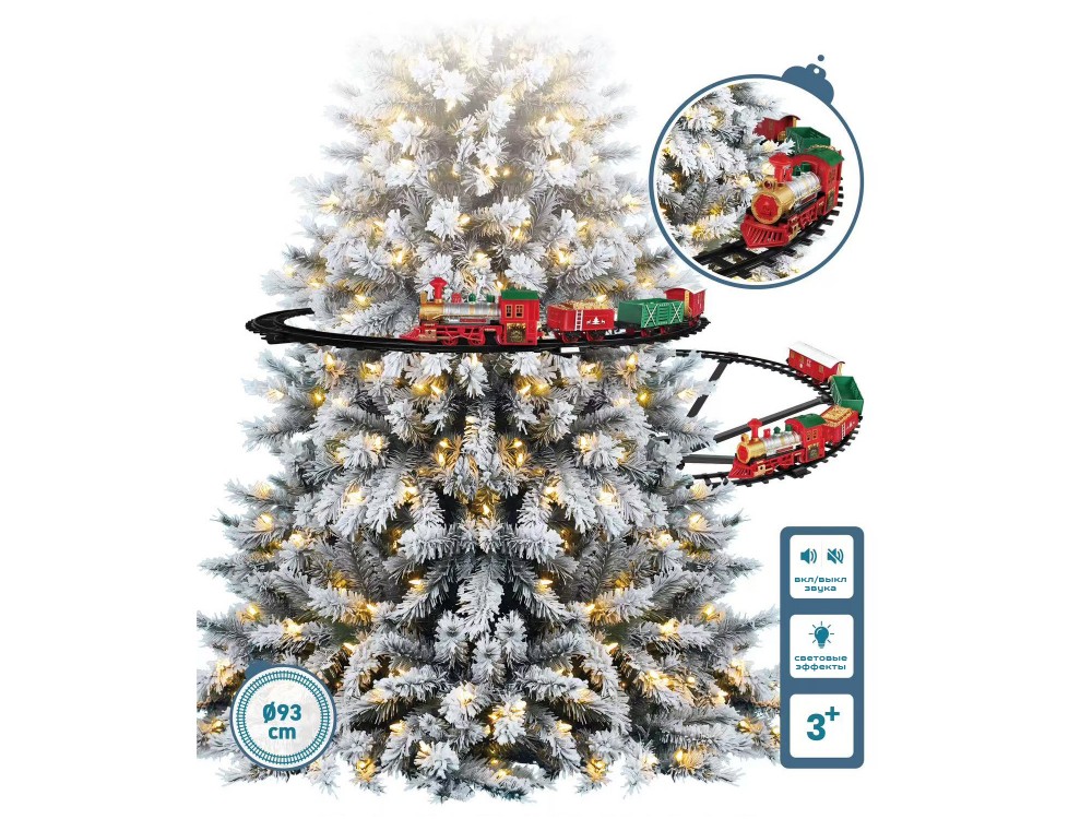 В комплекте можно найти детали дороги, специальные крепления и болты, паровоз, 3 вагона. Пошаговая инструкция на обороте коробки поможет правильно закрепить железную дорогу на стволе елки. Световые и звуковые эффекты добавят реализма игре. Крепление регулируется под елочный ствол любой толщины. Для успешной работы железной дороги объем елки не должен превышать 90 см.
